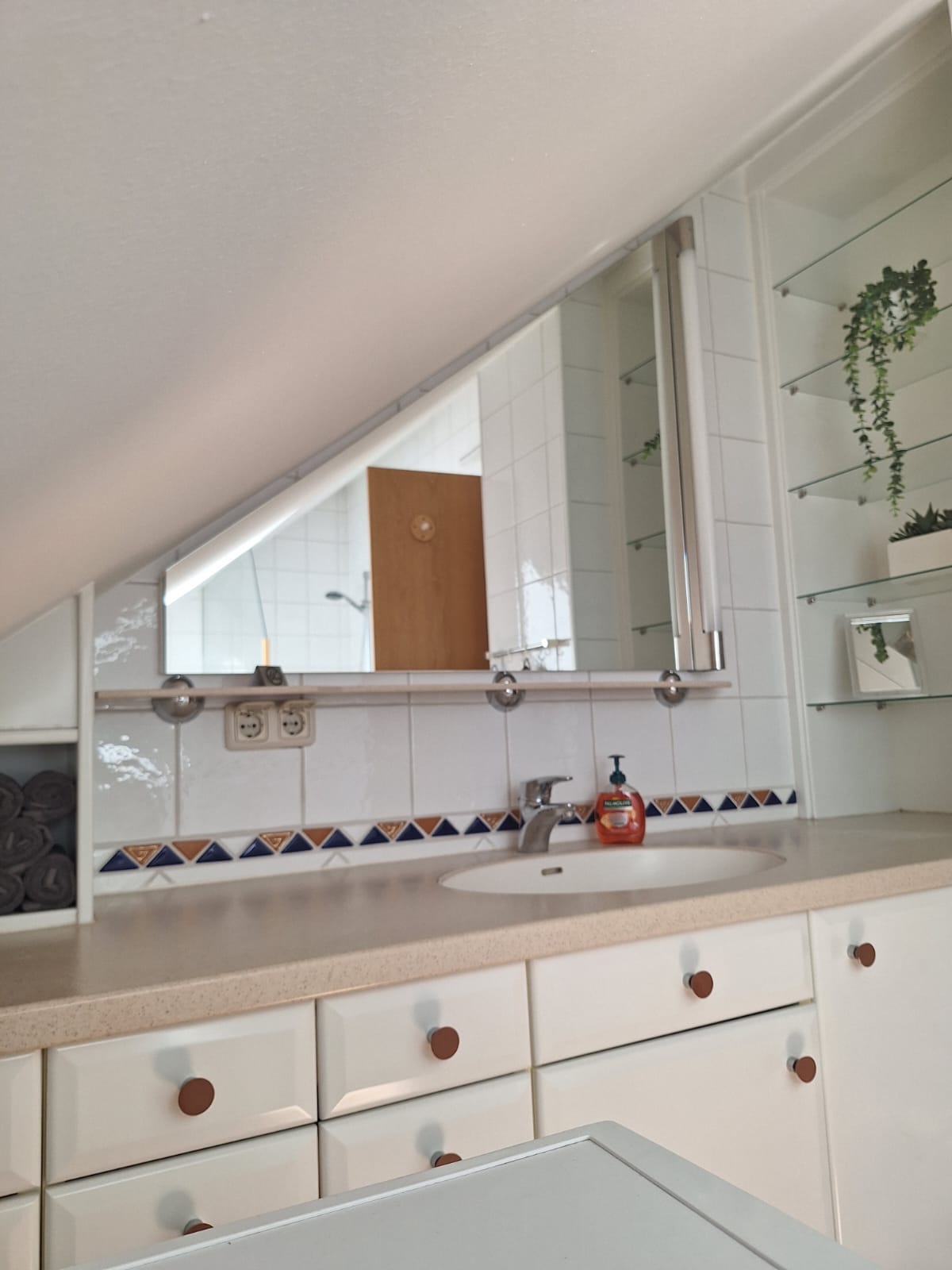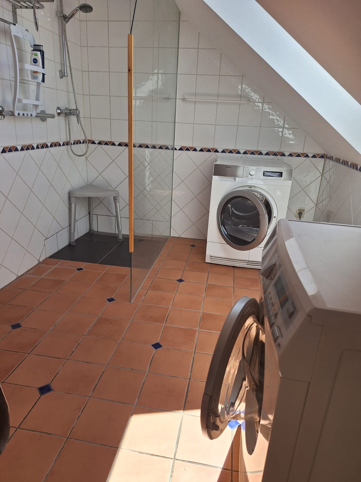 Das moderne Bad (Toilette extra) ist mit einer geräumigen Dusche ausgestattet und sorgt für einen erfrischenden Start in den Tag. Auch eine Waschmaschine sowie ein Wäschetrockner stehen zur Verfügung.