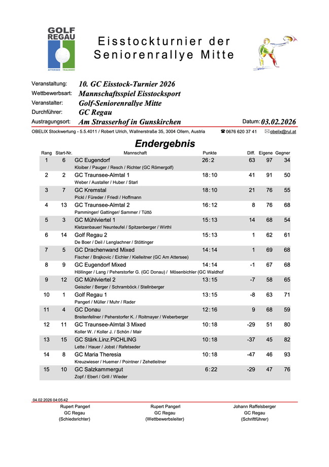 Bei optimalen Bedingungen in der Stocksporthalle beim „Strasserhof“ in Gunskirchen mit sieben langen Eisbahnen traten 15 Moarschaften an. Das Turnier wurde mustergültig vom Titelverteidiger Golf Regau organisiert und der GC Traunsee Almtal ging heuer mit drei Mannschaften aufs Eis.